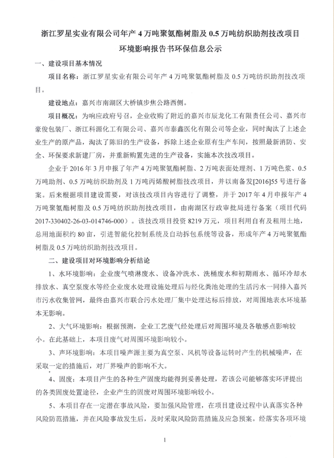 4萬噸樹脂及0.5萬噸助劑技改項目環保信息公示